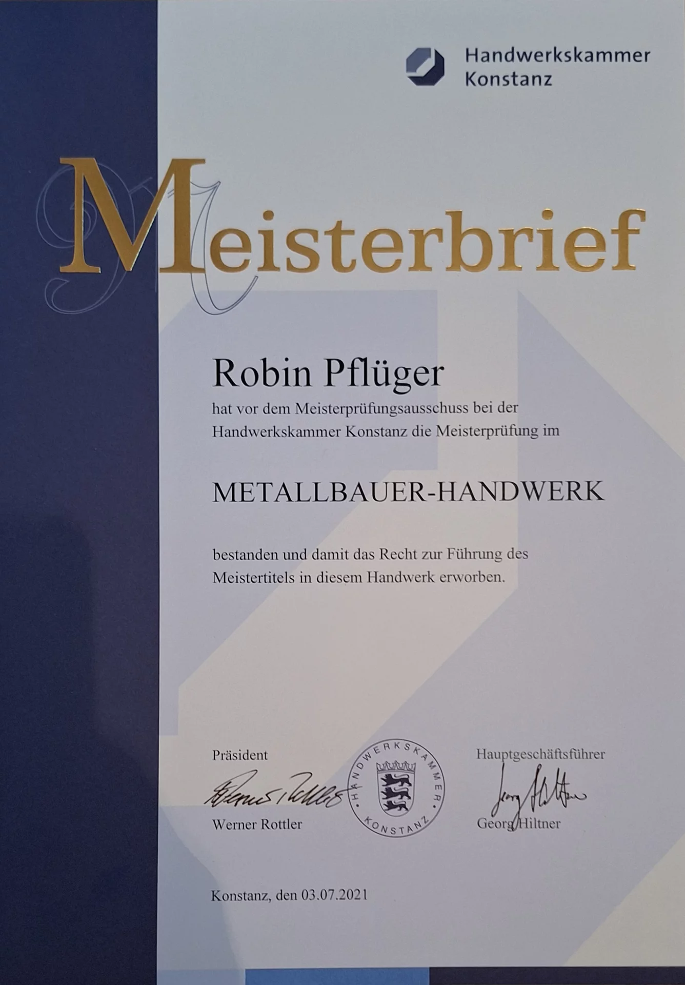 - Weiterbildung zum Metallbaumeister bei der Handwerkskammer Konstanz - 2020 bis 2021